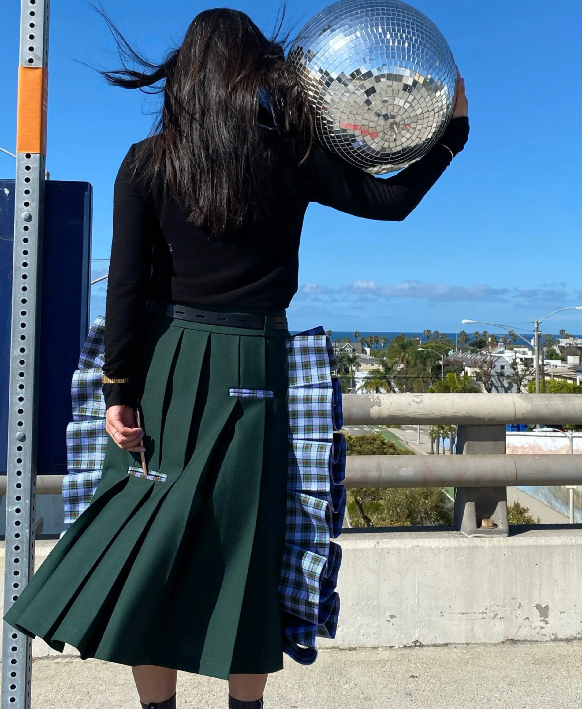 A one-of-a-kind design, knife-pleated with side ruffles in emerald green tropical wool and houndstooth plaid cotton twill.